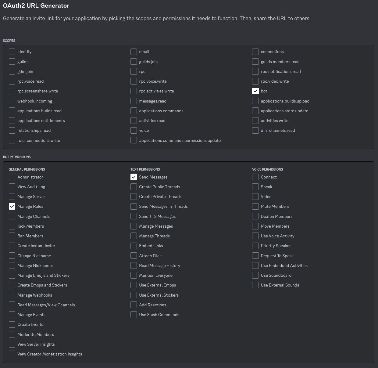 Bot Permissions, make sure thatSend MessagesandManage Rolesis checked.