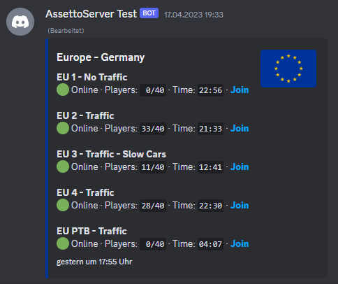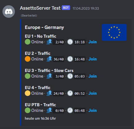 The server status message can be posted by using the command /server-status <name> in a channel, for example /server-status srp-eu.
