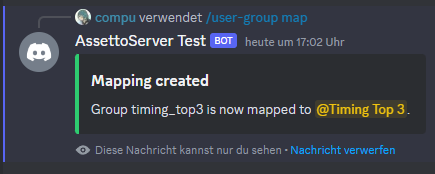 Next, use the /user-group map command to map this user group to a Discord role. For example /user-group map timing_top3 <your role>: